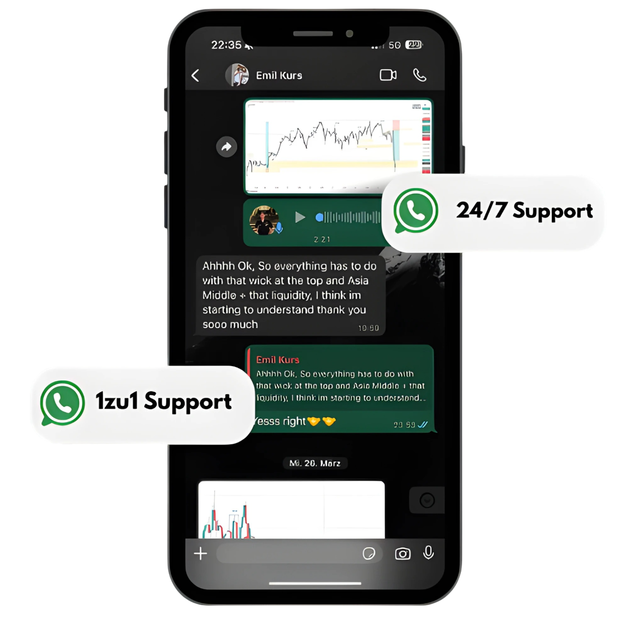 Du bekommst nicht nur theoretisches Wissen, sondern echte Unterstützung im Alltag: Deine Trades werden gemeinsam analysiert, Fehlerquellen aufgedeckt und Optimierungsmöglichkeiten besprochen — individuell, persönlich und auf dein Trading-Level abgestimmt. So entwickelst du Sicherheit, Routine und ein klares Verständnis für profitable Entscheidungen am Markt.
