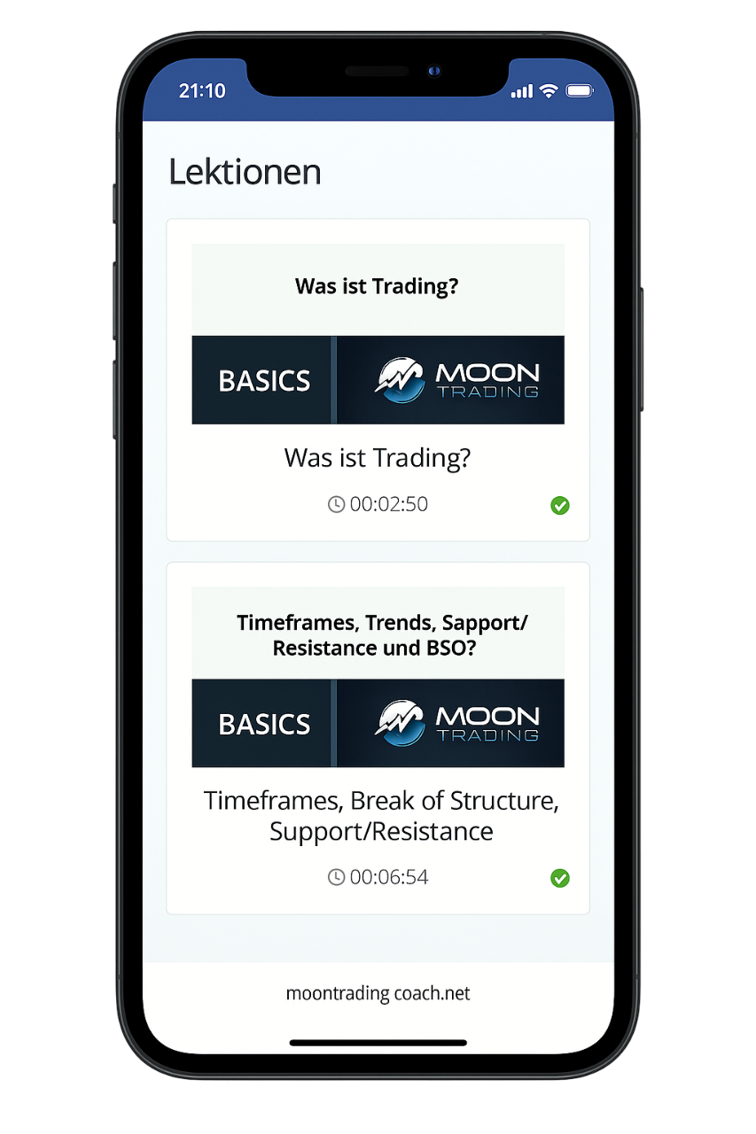 Unsere Lerninhalte sind logisch aufgebaut und führen dich Schritt für Schritt von den Grundlagen bis zur praktischen Anwendung. Du lernst nicht nur theoretisches Wissen, sondern setzt es direkt in praxisnahen Übungen und realen Marktsituationen um. So entsteht ein klarer Lernpfad, der dich sicher durch alle Phasen des Tradings begleitet — von den Basics bis zur eigenständigen Umsetzung.